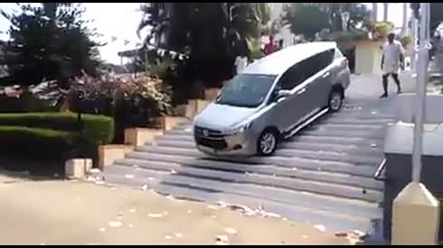 真有勇气 老人驾驶新车从台阶上开下来
