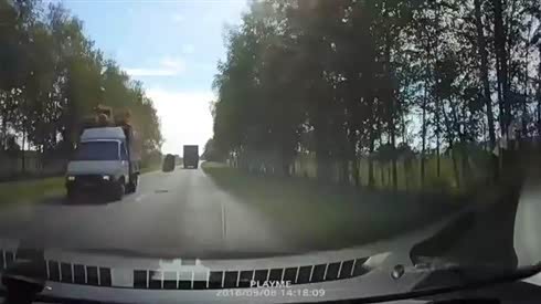 真倒霉 摄像车撞上遗撒下来的大包裹