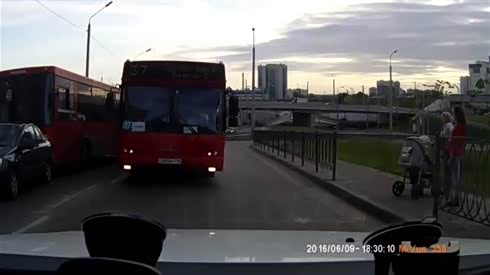 太不走运!轿车让行人惨遭公交车追尾