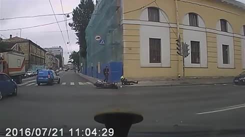 司机翻滚至路边 摄像车拐弯带倒摩托