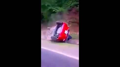 这是怎么了? 小轿车过弯失控冲下马路