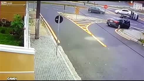 竟把车撞翻了 摩托与掉头车辆高速相撞