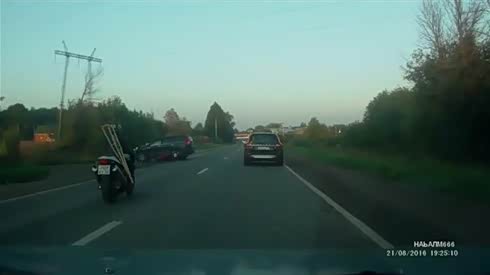 事发突然 摩托司机超车时被撞进沟里