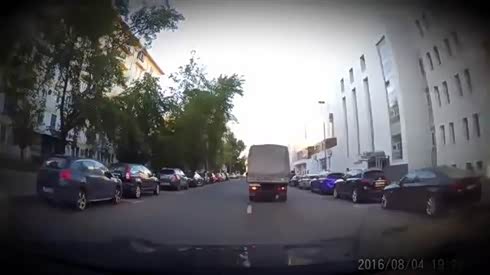 神躲避!轿车横穿马路险些害惨货车