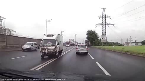 这回破相了!实拍厢式货车雨天失控