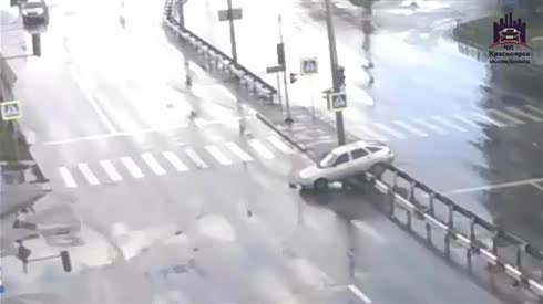 雨天车速太快 轿车过水坑失控蹿上护栏