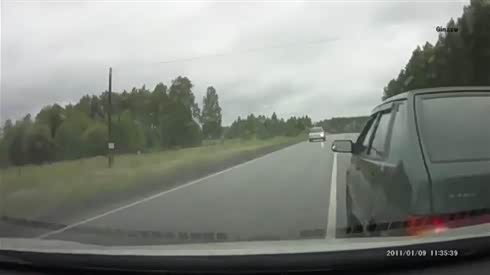 差点撞上电线杆 摄像车加速超车惨被别