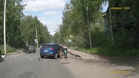 撞的够呛 摩托司机直直撞趴在SUV上