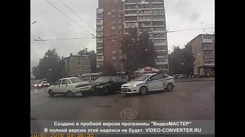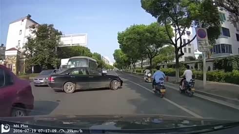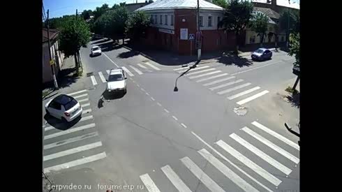 撞的不轻 路口实拍小轿车撞翻摩托车