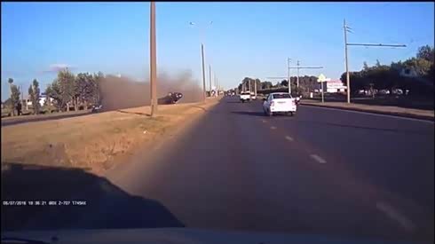 超级恐怖 轿车连续翻滚现场尘土飞扬