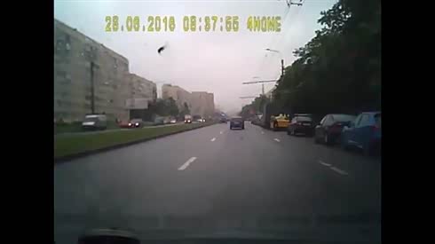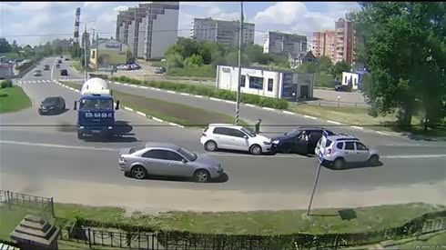 标志杆被撞倒 摄像车实拍路口两车相撞