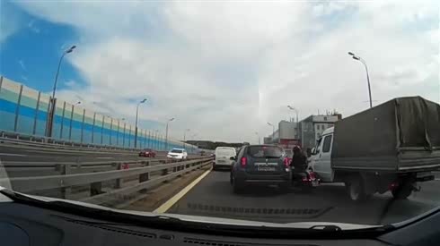 这就尴尬了 骑摩托男子穿越夹缝失败