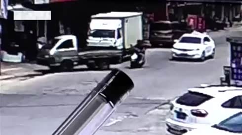 惊险一幕 货车倒车撞翻电瓶车人遭碾压