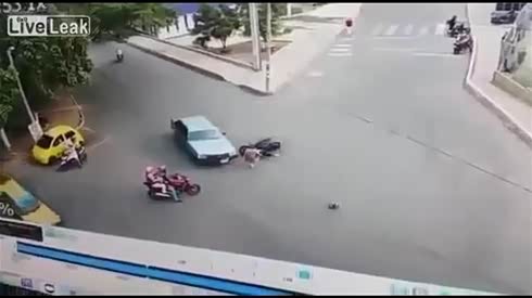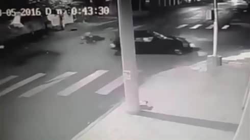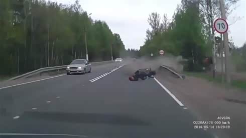 摔惨了 摩托车追尾小轿车摔出十几米