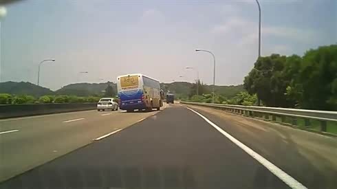 左摇右摆 实拍大巴车高速突然失控倾倒