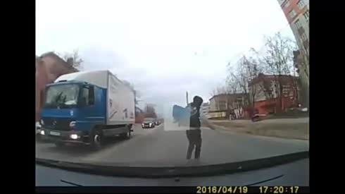 险象环生 看行人过马路途中险些被撞