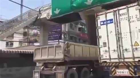 擎天柱变形 看自卸卡车被桥洞卡上天