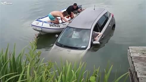 幸亏及时获救 老夫妇驾车掉进水塘中