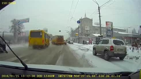 雪中的杯具 公交车一个摆尾途锐倒霉了