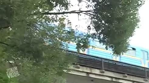 疯起来不要命 男子从桥上的火车顶跳下