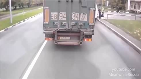 奥迪对大货车竖中指 瞬间被撞残