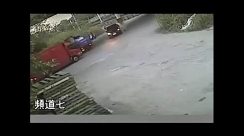 恐怖瞬间 失控轿车被大货车迎面撞碎