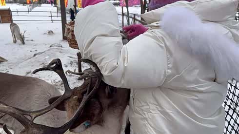 看队友在亚布力驯鹿园手忙脚乱喂鹿