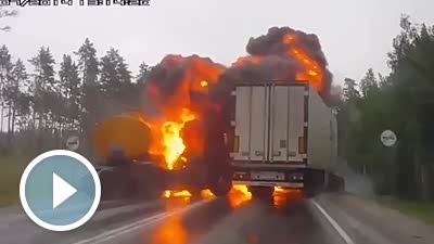 油罐车相撞瞬间起火 淡定司机从容逃生