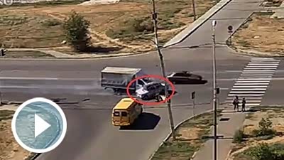 路口惊魂!实拍左转小轿车遭货车撞惨